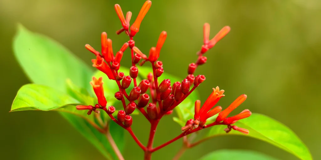 Tubular red-orange flowers that attract butterflies and hummingbirds, accompanied by glossy green leaves.