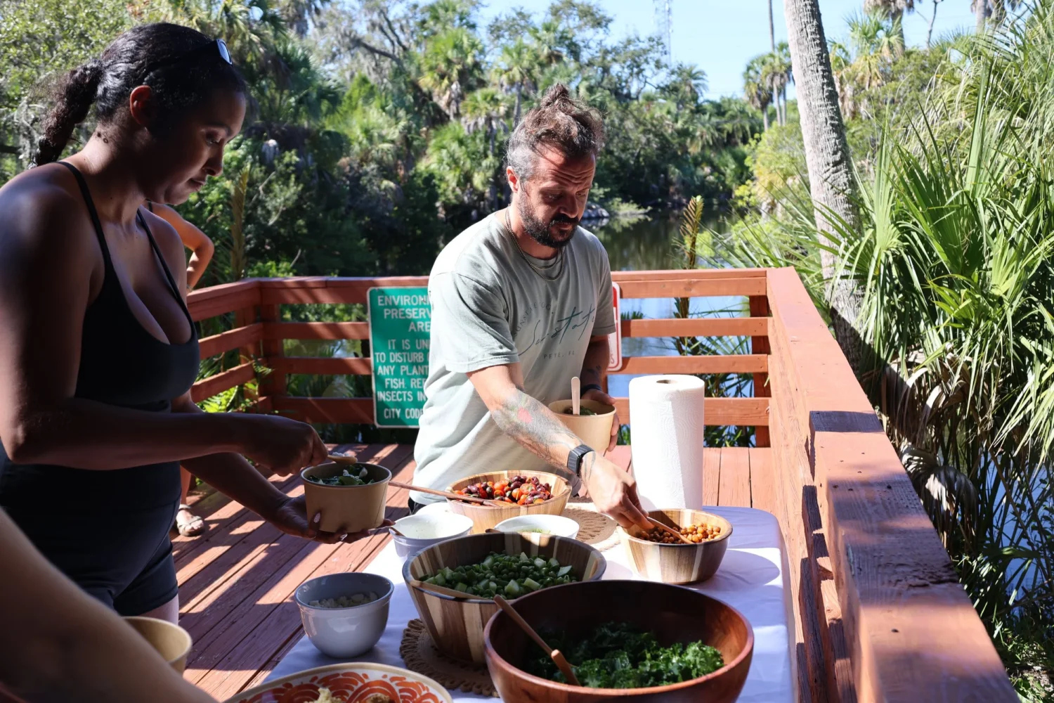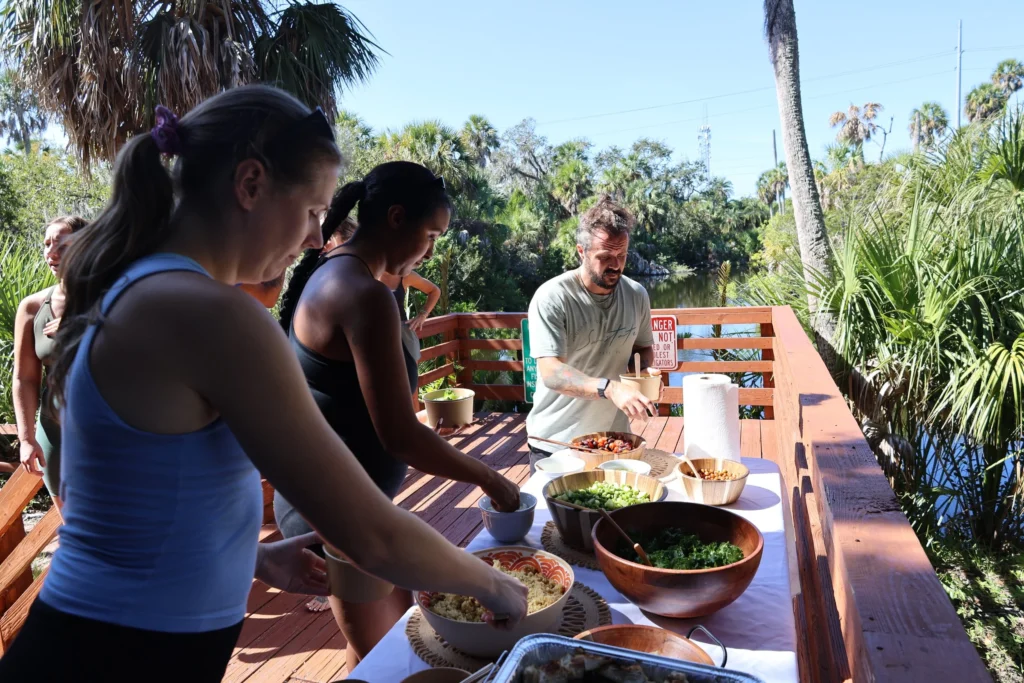 peas, creating a colorful and nutrient-packed meal. Enjoying lunch at picnic tables by the water, guests sipped on refreshing beverages from Herban Flow and LMNT, soaking in the peaceful surroundings.